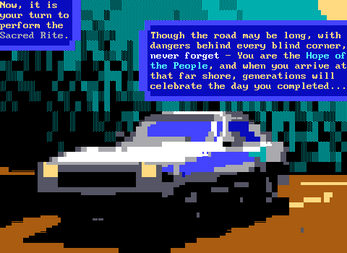 CANNONBALL RUN 2177 is a simulation/management game with many potential encounters, decisions, and opportunities along a 4625km (2875 mi) journey from New York City, NY to Redondo Beach, CA. Game events come down to a limited set of choices - the events that occur, the choices you make, and whether you succeed or fail all depend on your car's loadout, inventory, driver, passengers, and other factors such as weather. Because these factors are constantly changing, you can play the game many times and come across something new every time.